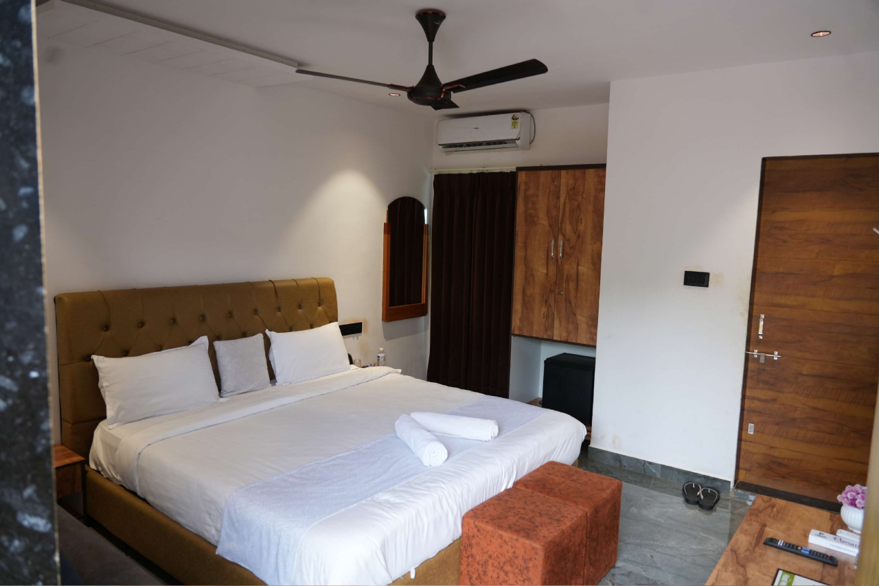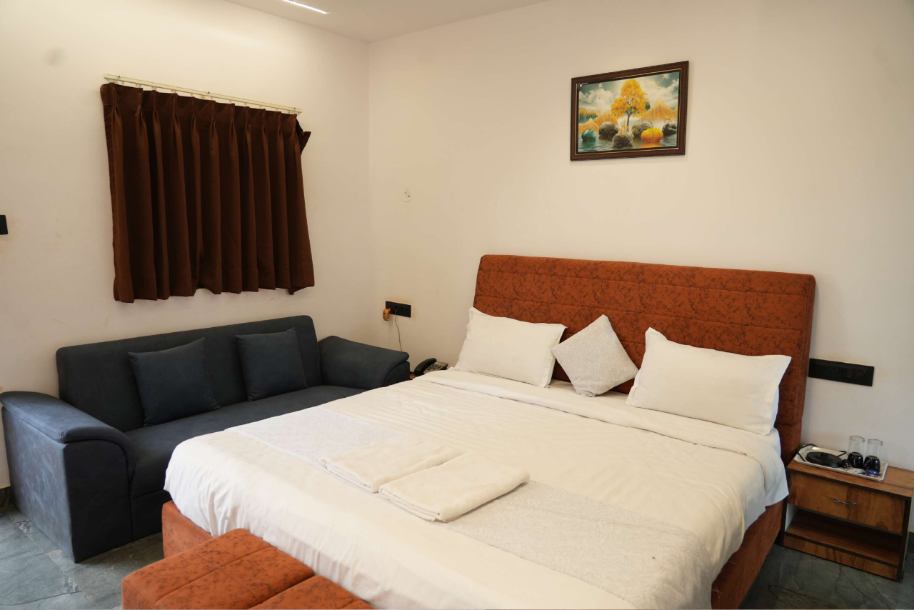 Deluxe Cottage with King Size Bed – Experience the perfect blend of comfort and elegance in our Deluxe Cottage, thoughtfully designed for relaxation and peace. Each cottage features a spacious king-size bed, cozy interiors, and modern amenities to make your stay truly memorable. Surrounded by scenic views and a tranquil ambiance, it offers the ideal retreat for couples and families alike. Enjoy a refreshing stay with warm hospitality, a private sit-out area, and all the comforts you need for a rejuvenating getaway.